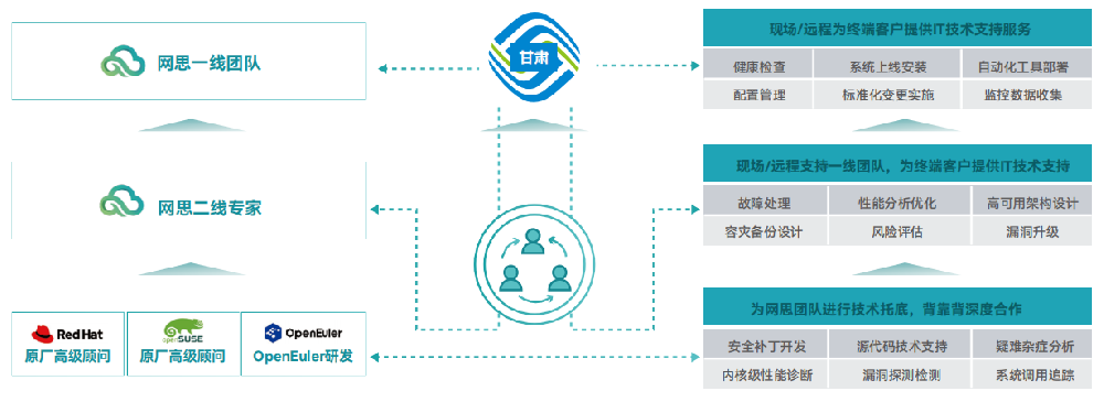 网思科技作为Redhat、Oracle、IBM、华为、腾讯等厂商产品的高级合作伙伴和移动集采代理商,具备完善的服务资质和能力。网思科技的服务团队分布于四个大区17个城市,形成三级技术支持体系,拥有一批红帽专业认证的RHCE/RHCA、Oracle OCP/OCM和Mysql等产品的专家以及运维管理解决方案的专家、咨询顾问,有能力提供覆盖全国范围的专业且高效的数据中心数智化解决方案和高可用运维支撑服务,为客户数据中心的安全运行和高效运营保驾护航。